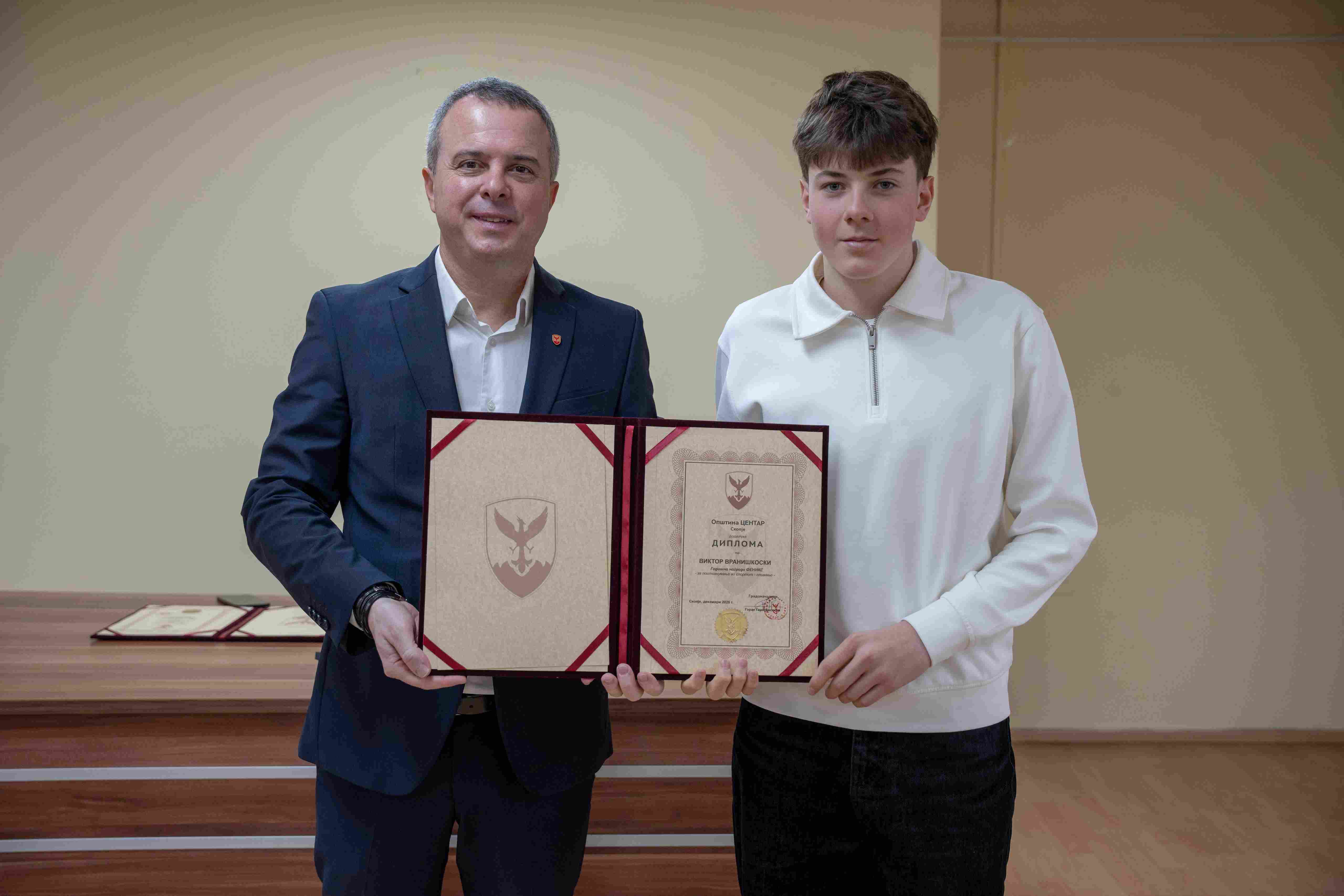 Општина Центар ја додели највисоката општинска награда „Феникс“ за 2025 година, со која се наградуваат исклучителни постигнувања во науката, уметноста, културата, спортот, воспитувањето и образованието. Наградата им ја врачи градоначалникот Горан Герасимовски, кој истакна дека ова признание е јасен показател дека Центар ги вреднува знаењето, талентот и истрајноста.
