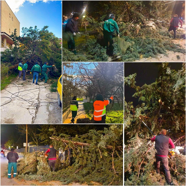 Екипите на терен претпладнево ги сечат и расчистуваат паднатите дрвја, ги отстрануваат скршените гранки за да се нормализира сообраќајот од застојот.