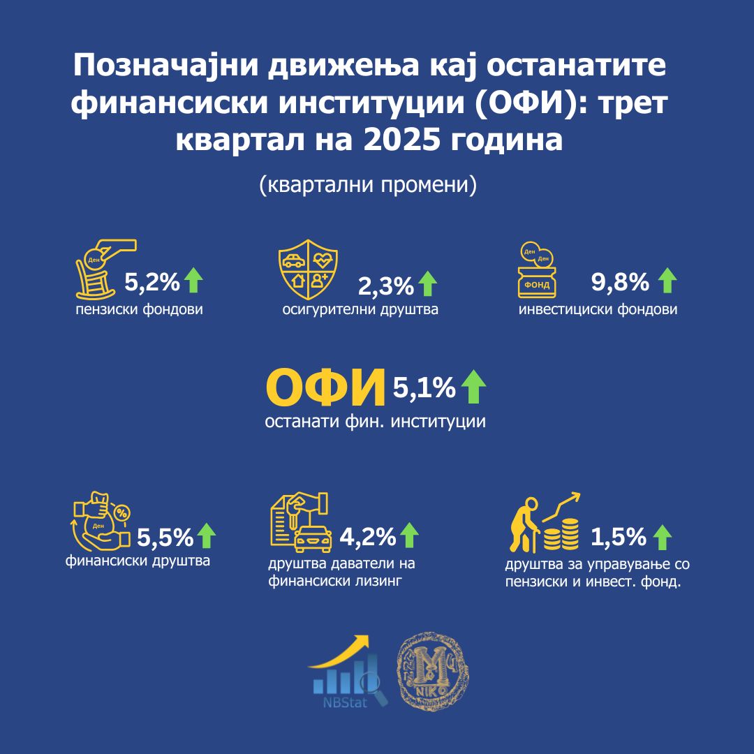 Вкупните средства на останатите финансиски институции (ОФИ) забележаа значителен раст во третиот квартал од годината, со квартално зголемување од 5,1% и импресивен годишен раст од 19,0%. Овој позитивен тренд е главно резултат на зголемените средства на пензиските фондови, при што дополнителен придонес имаат и повисоките средства на осигурителните друштва и инвестициските фондови. Позитивни движења се забележани и кај останатите потсектори.